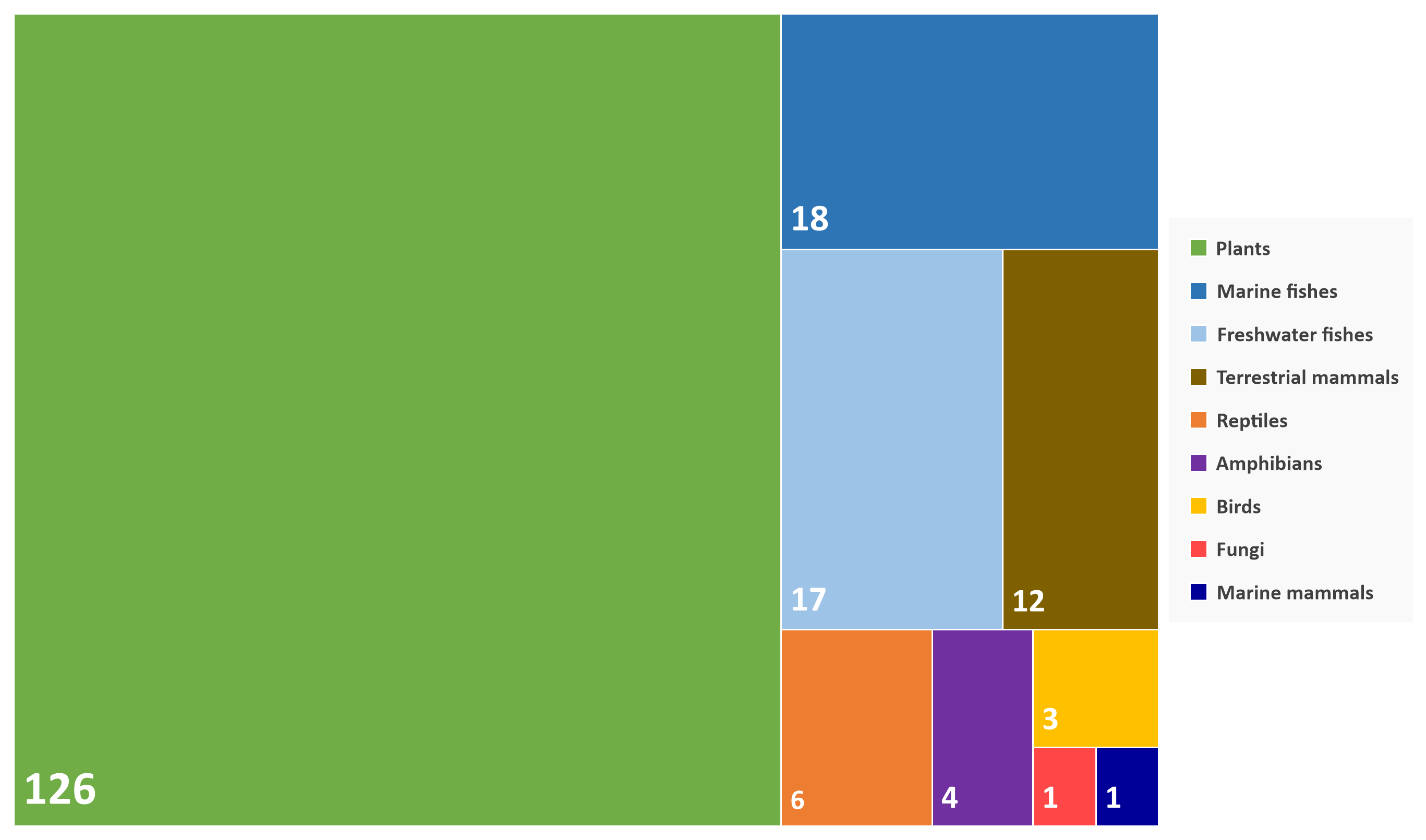 A total of 126 (67%) of the 188 KBA-triggering species were plants, and 23 (74%) of the 31 KBAs with a terrestrial component were triggered by plant species, including 2 sites triggered solely by plants. In addition, 12 species triggered 5 KBAs according to criterion A1e (global population of CR or EN species totally included in the site), including 11 plant species.