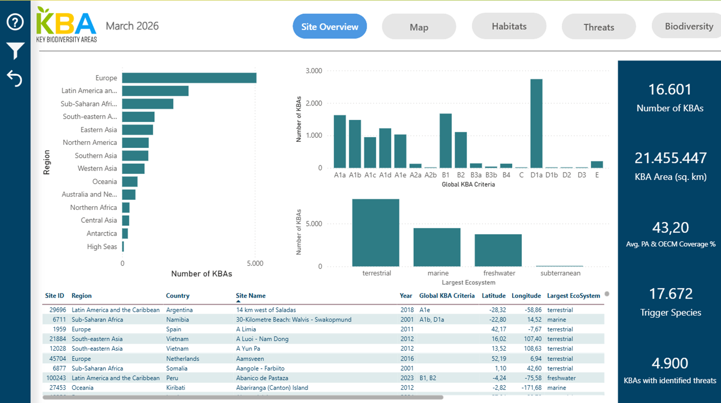 The latest update of the World Database of Key Biodiversity Areas WDKBA is now live. As of March 2026, the number of sites is a staggering 16,601 KBAs, including 19 brand new sites, and 27 previously existing KBAs that were reassessed since the last update in September 2025. Also, 3 sites were superseded having been replaced by some of the assessed or reassessed sites, and 17 legacy sites were delisted as KBAs. The boundaries of a further 19 sites were improved either to align them with protected areas, habitats, or other topography as appropriate and in consultation with the original proposers.